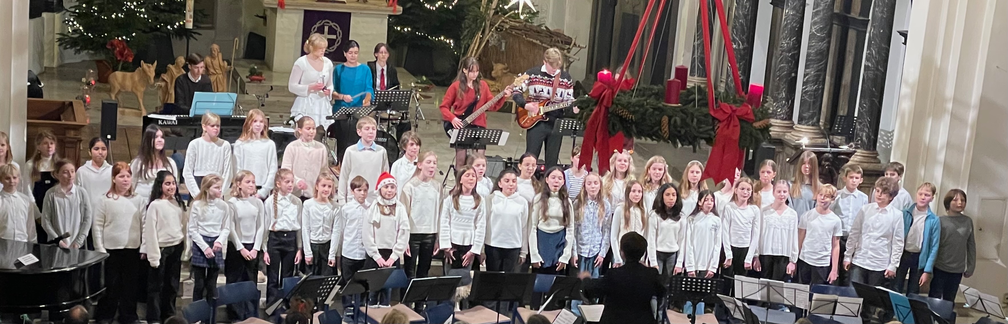 Dann folgten mit "Ding! Dong", "Solfege Santa" und dem "coolen Weihnachtsmann" drei heitere Weihnachtslieder der Chorklassen, einfühlsam und mit musikalischem Humor begleitet von der Schulband.