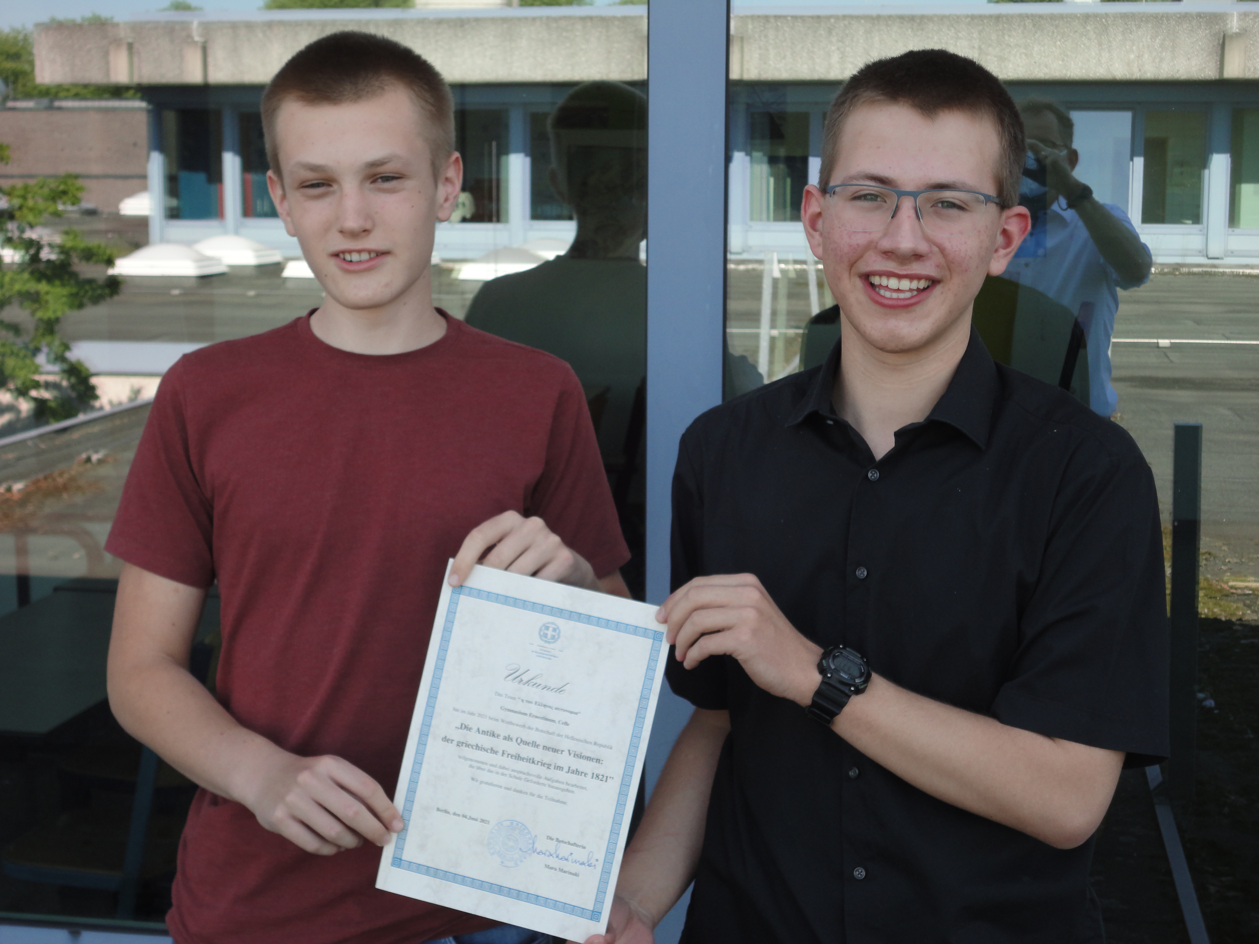 Post von der griechischen Botschaft: Lars Martens und Florian Piening (10GL) haben mit großem Erfolg am Wettbewerb teilgenommen. Für die Reise nach Athen hat es nicht gereicht, aber die beiden hatten sichtlich Freude bei der Produktion ihres Beitrages,