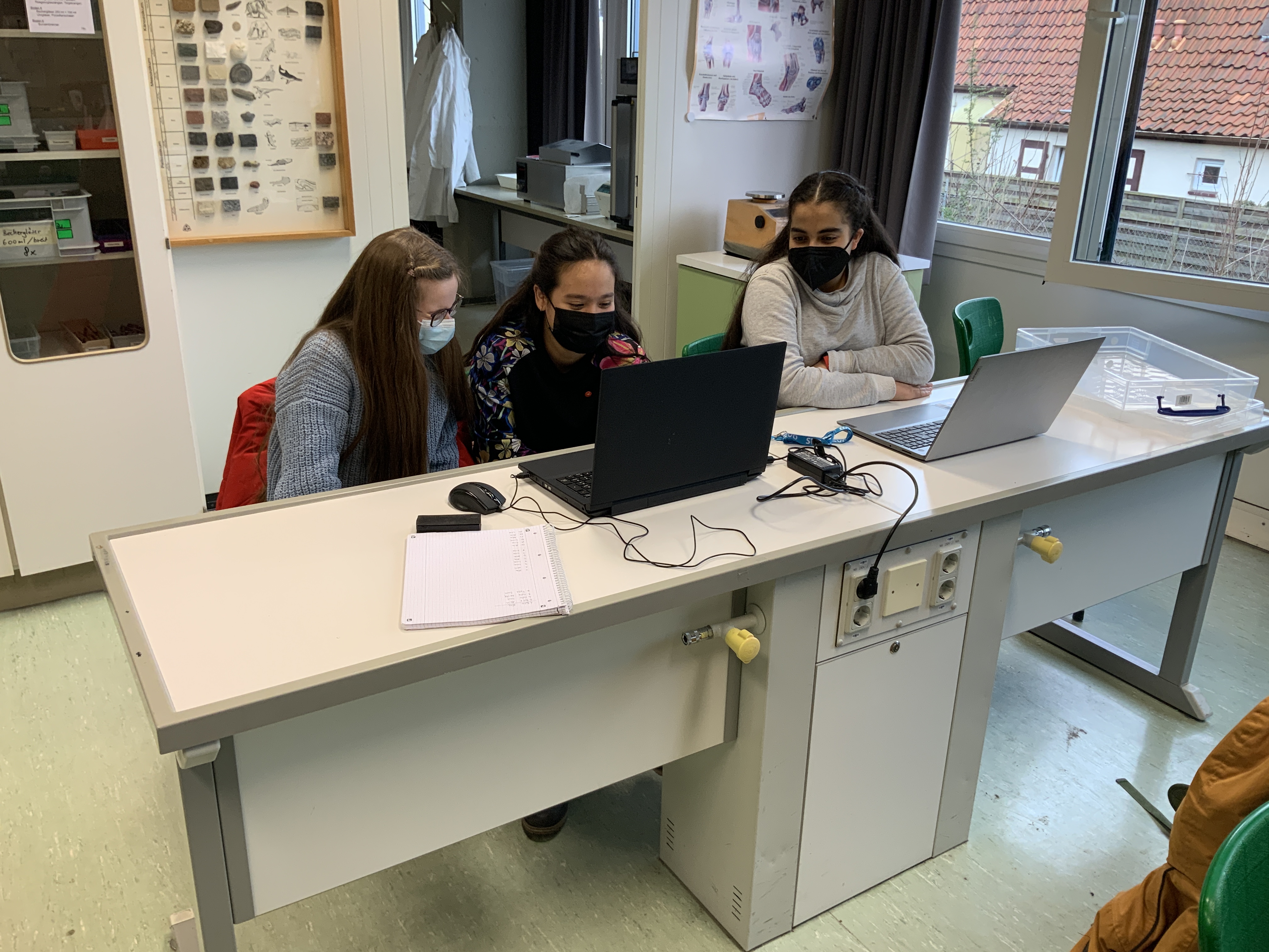 Beide Gruppen haben am Dienstag, den 15.02.22, ihre Projekte souverän den verschiedenen Jurys per Videoübertragung aus der Schule präsentiert. Nach einer kurzen Begrüßung durch die Wettbewerbsleiterin Frau Peters, die Stiftung Jugend forscht und den Geschäftsführer der SVO Herrn Schwenke gingen auch schon die Jurygespräche los. Unser Team durfte gleich in der ersten Runde starten. Gemeinsam hatten sich alle im Chemieraum für die Eröffnung versammelt. So konnten sich die Teilnehmerinnen auch gleich gegenseitig bei den Vorbereitungen unterstützen und auch die Nervosität wurde gemeinsam erträglicher.