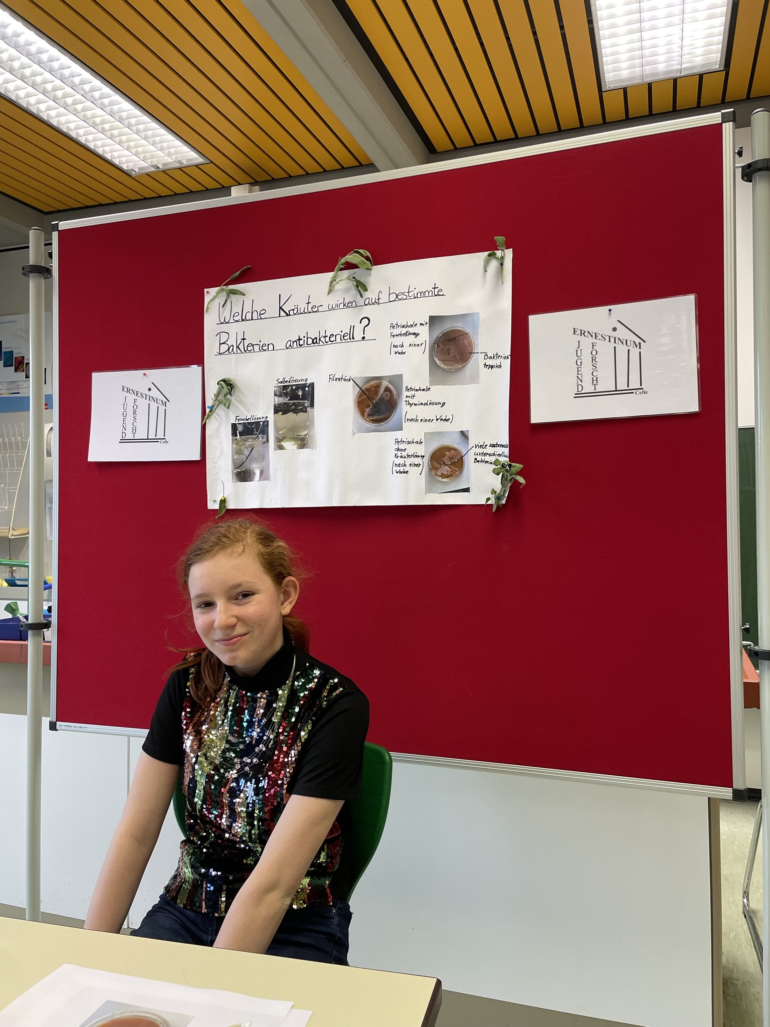 Katharina Fortmüller (7b) hatte sich schon lange mit der Frage „Welche Kräuter wirken auf bestimmte Bakterien antibakteriell?“ beschäftigt und trat damit im Themengebiet Biologie an. Nach langen Recherchearbeiten zur richtigen Durchführung und den passenden Kräutern konnte sie in diesem Jahr erste Ergebnisse in ihren Versuchen mit Salbei und Minze präsentieren.