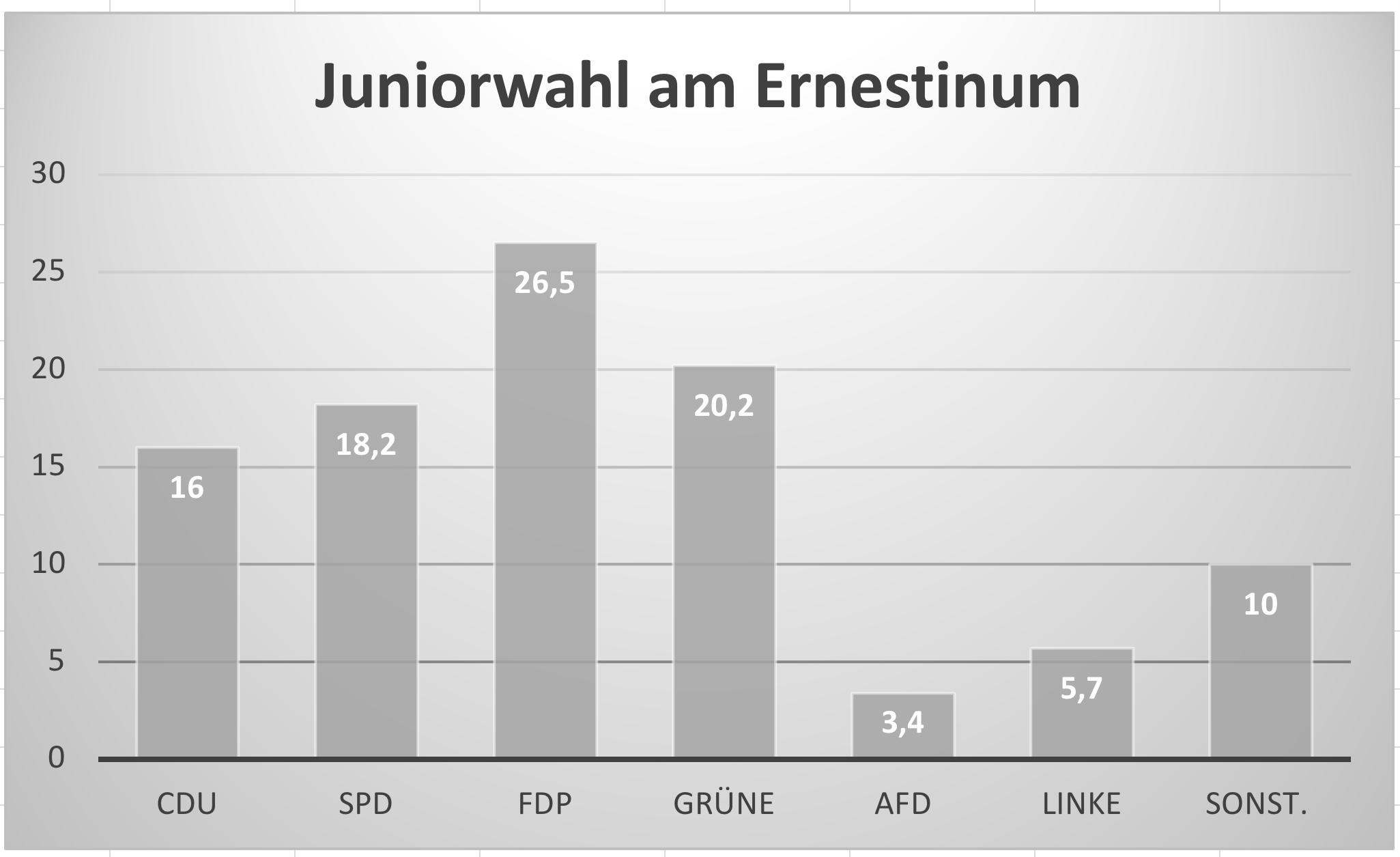Die stärkste Kraft am Ernestinum wurde die FDP mit 26,5% der abgegebenen Stimmen, gefolgt von den Grünen mit 20,2%. Die SPD erreichte 18,2%, die CDU 16,0% und die Linke 5,7%.