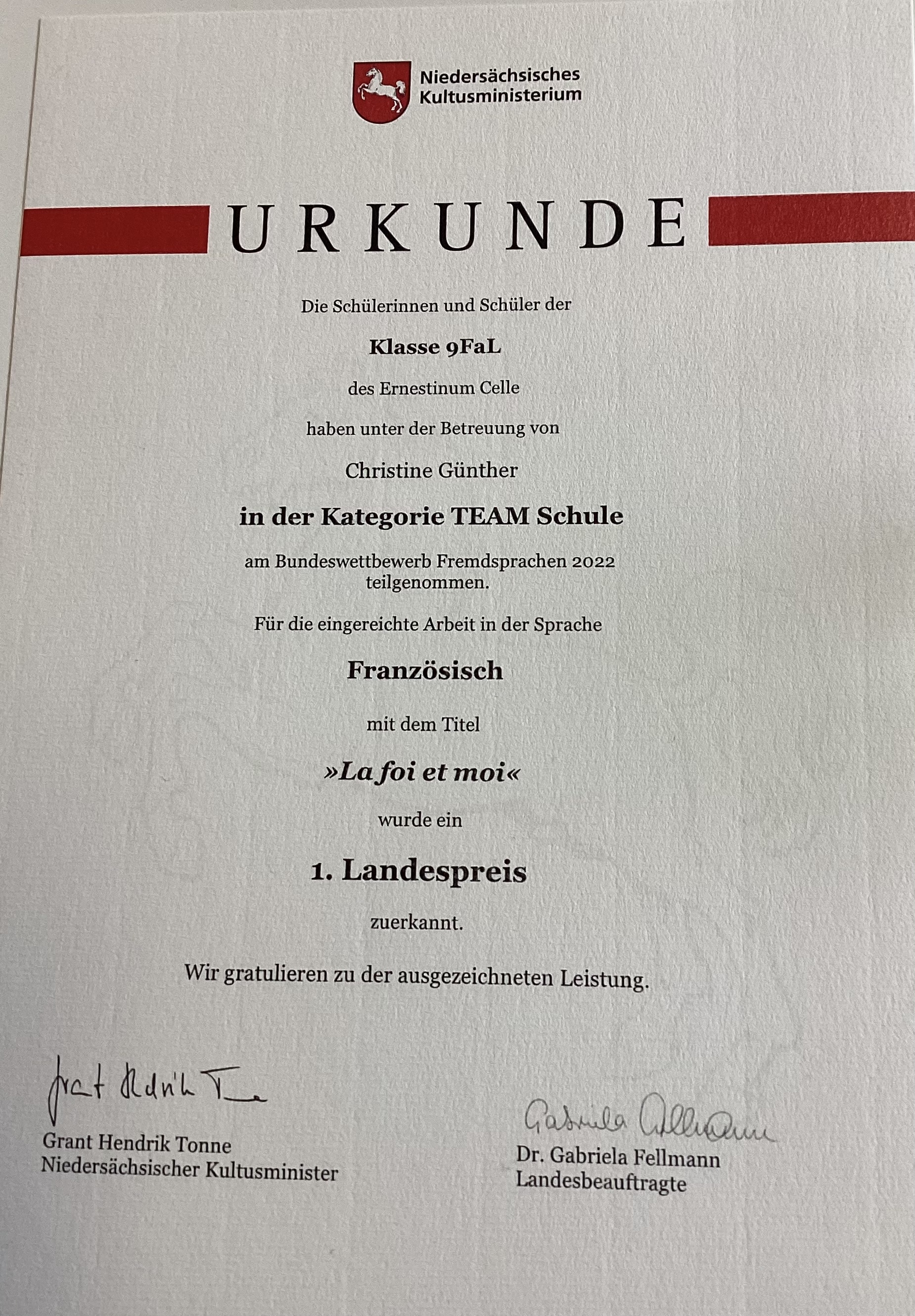 Den ersten Landespreis in Niedersachsen gewann neben einer Schule aus Hannover das Team der Klasse 9FaL des Ernestinums mit dem französischsprachigen Beitrag „Ma foi et moi“, in dem es um das Kopftuchverbot an französischen Schulen ging. Somit qualifizierte sich diese aus drei Schülerin-nen und einem Schüler bestehende Gruppe, die seit der 5. Klasse Französisch lernt, für die Teil-nahme am Bundesentscheid, der am Humboldt-Gymnasium Potsdam ausgetragen wurde.