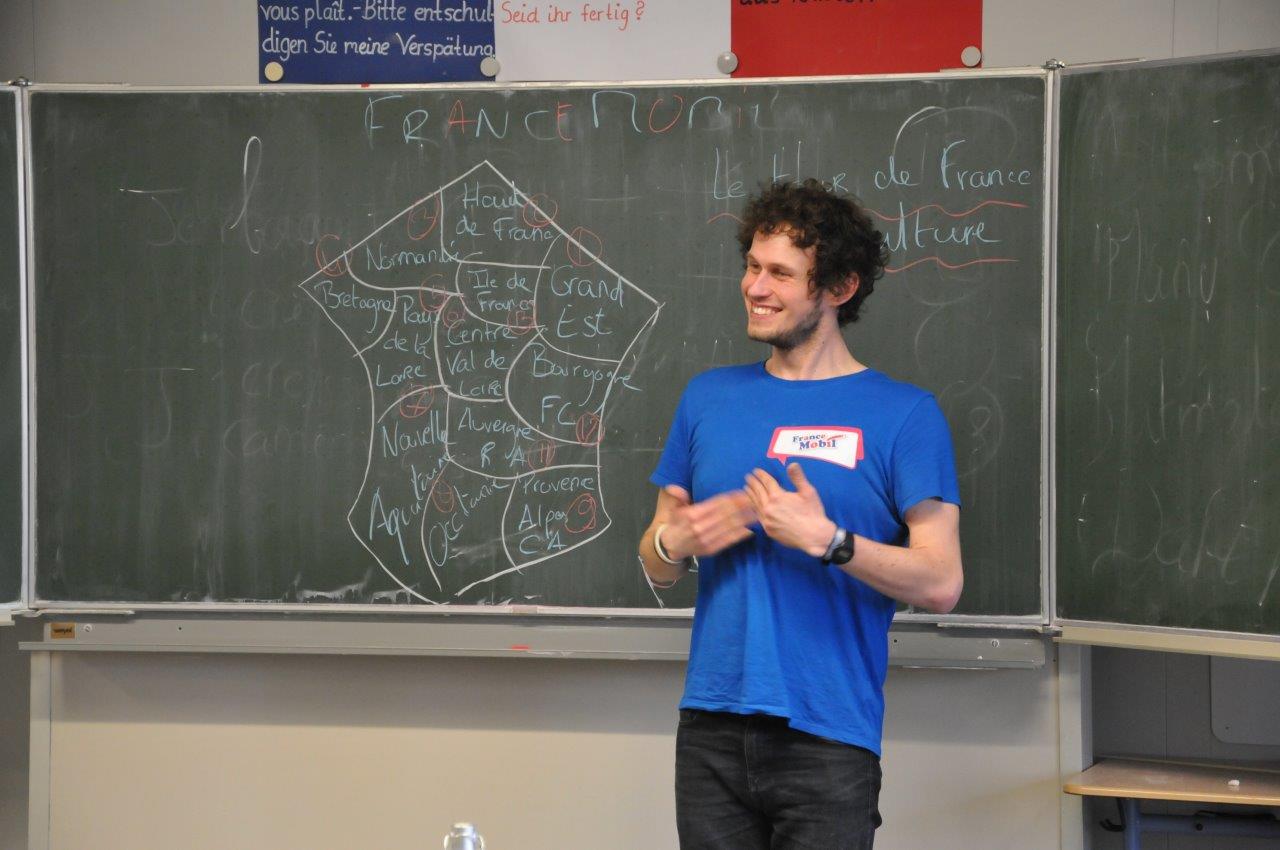 Und auch für die etwas weiter fortgeschrittenen Schülerinnen und Schüler der 8. und 9. Jahrgangsstufe hatte „Monsieur FranceMobil“ interessante Sprachanimationen dabei. In einem Tour de France wetteiferten die Lernenden um die meisten Punkte, denn es galt, landeskundliche Fragen bestmöglich zu beantworten – auf Französisch, versteht sich! Auch hier stellte der Lektor heraus, dass unsere Schülerinnen und Schüler bereits ein wirklich gutes sprachliches Niveau erreicht haben.